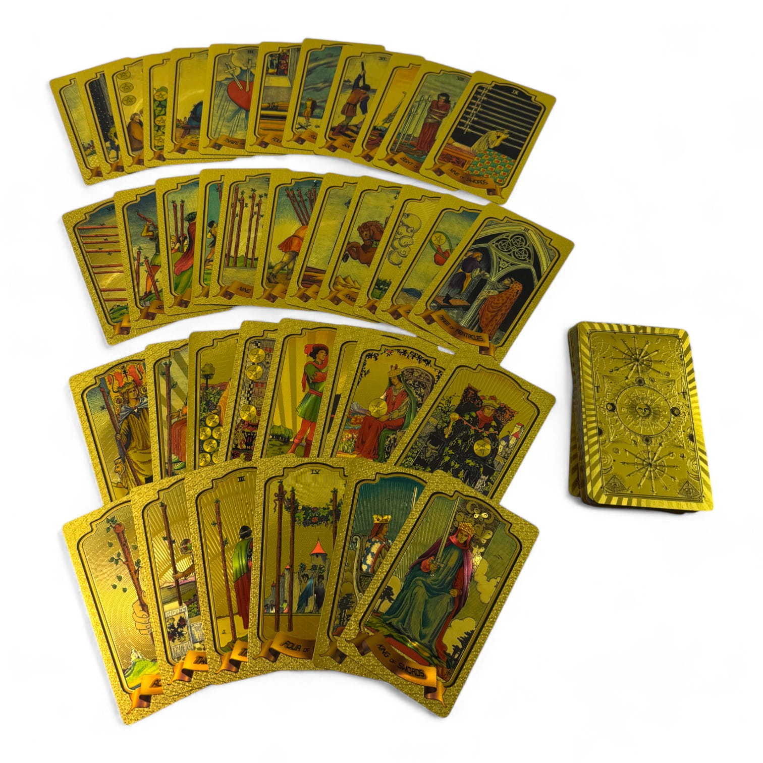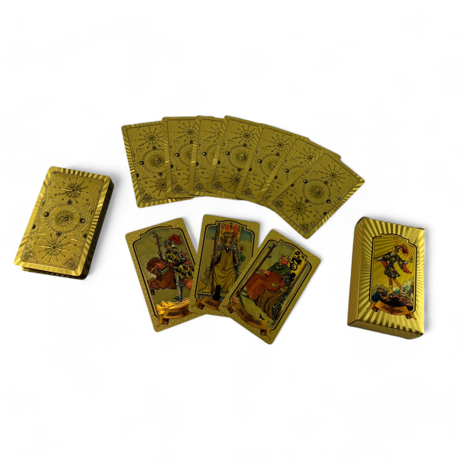 Золотистое покрытие придает картам роскошный вид, создавая уникальную атмосферу во время работы с колодой.