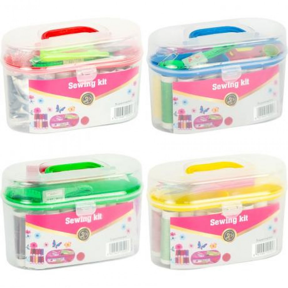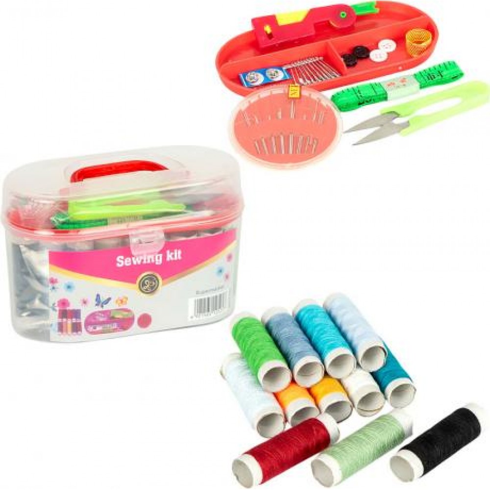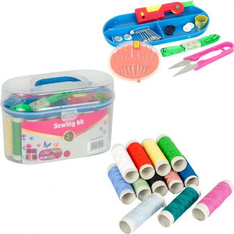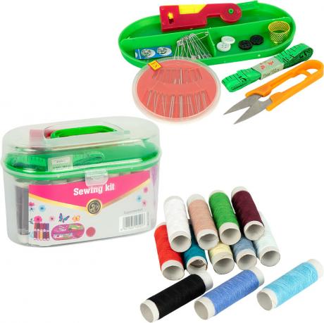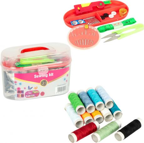 Набір для шиття в компактному контейнері. Включає 10 кольорів ниток, 4 гудзики, набір голок, наперсток, 2 нитковтягувача, ножиці, сантиметр та 10 шпильок. Розмір упаковки становить 15х9х7 см.