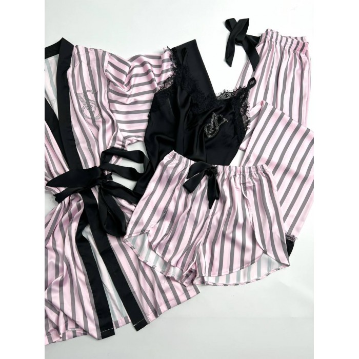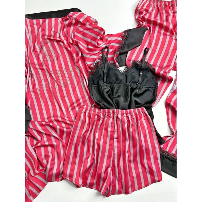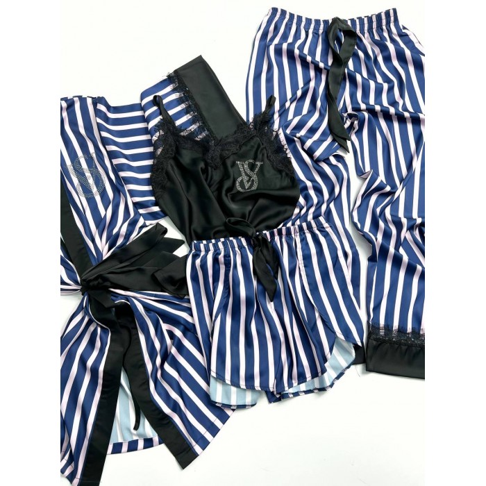 | ОПИСАНИЕ | Атласная пижама со стразами, в набор входят майка, шорты, штаны и халат. Бретель на майке регулируется, штаны и шорты на средней посадке. |
