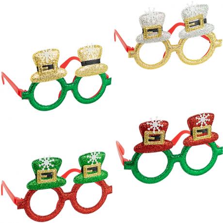 Новорічні окуляри без скелець — оригінальний аксесуар із блискітковим декором у святковому стилі. Виготовлені з легкого пластику з глітерним покриттям і прикрашені фігурними елементами. Розмір: ширина 14 см, висота 9,5 см, діаметр оправи 6 см, отвір 4,5 см. Окуляри міцні, добре тримаються та підходять для дітей і дорослих. Чудово доповнять новорічний костюм або святковий образ.