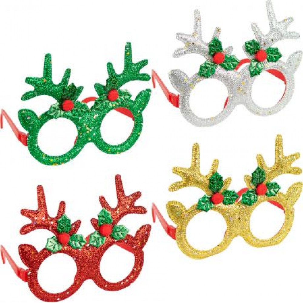 Новорічні окуляри без скелець із декоративними оленячими ріжками та святковим декором. Прикрашені глітером, зеленими листочками й червоними ягідками. Виготовлені з легкого пластику, зручно сидять і добре тримаються. Розмір: ширина 14 см, висота 12 см, діаметр оправи — 6 см. Чудовий аксесуар для карнавалу, фотосесій і святкового настрою.