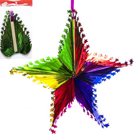 Підвісна прикраса «Зірка» 50×17 см — яскравий елемент святкового декору, що додає блиску та настрою будь-якому приміщенню. Виготовлена з легкого фольгованого матеріалу, який красиво відбиває світло та переливається різними відтінками. Прикраса легко складається, зручно зберігається у компактній упаковці. Ідеально підходить для новорічного оформлення, святкових вечірок, дитячих ранків і вітрин. Легка у встановленні та придатна для багаторазового використання.