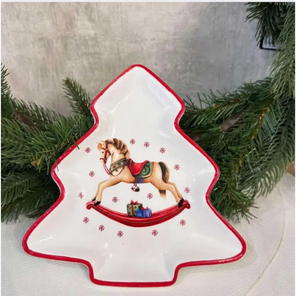 Керамическая тарелка(20*21см) в форме ёлочки С Рождественским рисунком и символом года Лошадка