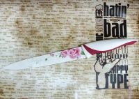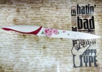 Материал клинка: высокоуглеродистая нержавеющая сталь с цветным антибактериальным покрытием. Материал рукояти: высококачественный пищевой пластик с цветными прорезиненными вставками.