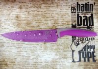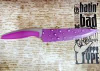 Материал клинка: высокоуглеродистая нержавеющая сталь с цветным антибактериальным покрытием. Материал рукояти: высококачественный пищевой пластик с цветными прорезиненными вставками.