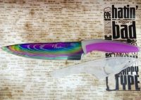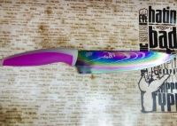 Материал клинка: высокоуглеродистая нержавеющая сталь с цветным антибактериальным покрытием. Материал рукояти: высококачественный пищевой пластик с цветными прорезиненными вставками.