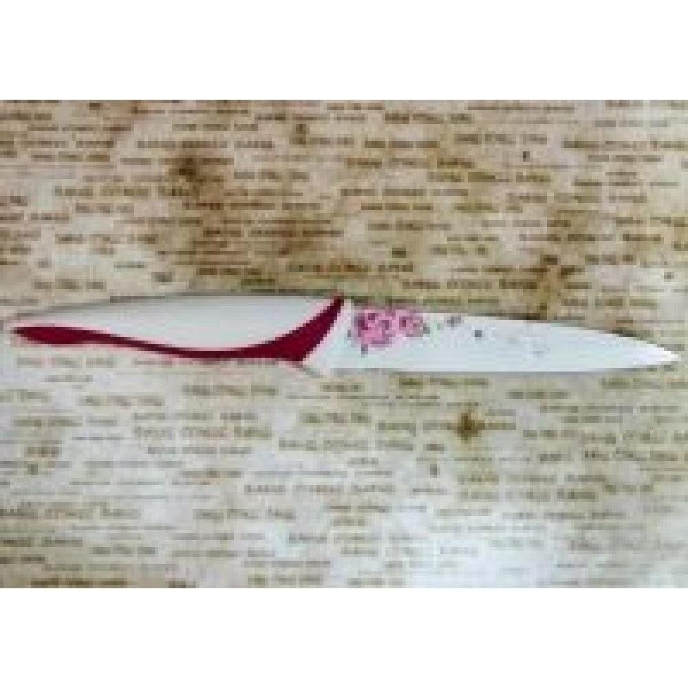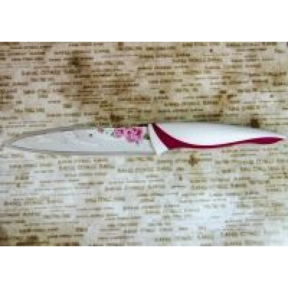 Материал клинка: высокоуглеродистая нержавеющая сталь с цветным антибактериальным покрытием. Материал рукояти: высококачественный пищевой пластик с цветными прорезиненными вставками.