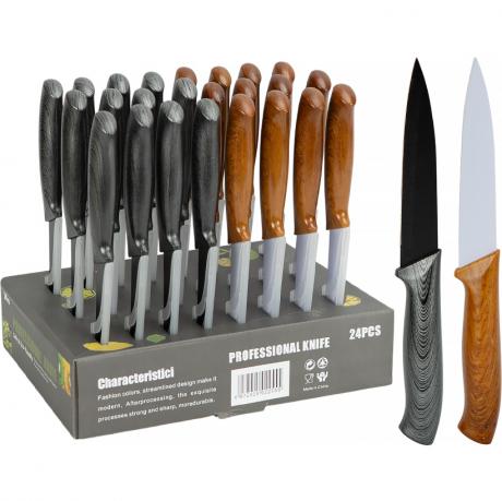 Кухонний ніж професійний 24 см (лезо 13 см) з ергономічною пластиковою ручкою під дерево. Виготовлений із міцної нержавіючої сталі, має гостре лезо, яке підходить для нарізання м’яса, риби, овочів та інших продуктів. Зручна ручка забезпечує надійне захоплення та комфорт у використанні. У комплекті є пластиковий захисний чохол для безпечного зберігання. Ціна вказана за 1 ніж, в упаковці 24 шт.Коробка може використовуватися як підставка для зручного зберігання та демонстрації ножів.