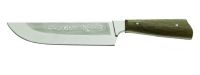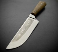 Изготовлен из высококачественной стали 40х13, которая проходит специальный цикл термообработки, позволяющей достичь твёрдости 55 единиц по Роквеллу (общеевропейский стандарт JSO) без потери гибкости. Эта сталь устойчива к корозии и хорошо держит заточку. Притын (накладка у основания лезвия) повышает комфортность и безопасность работы.