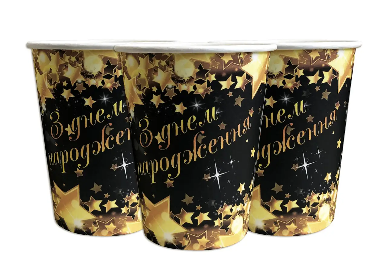 Стаканчики одноразовые бумажные 250гр "Happy Birthday золото" 10шт (1 пачка)