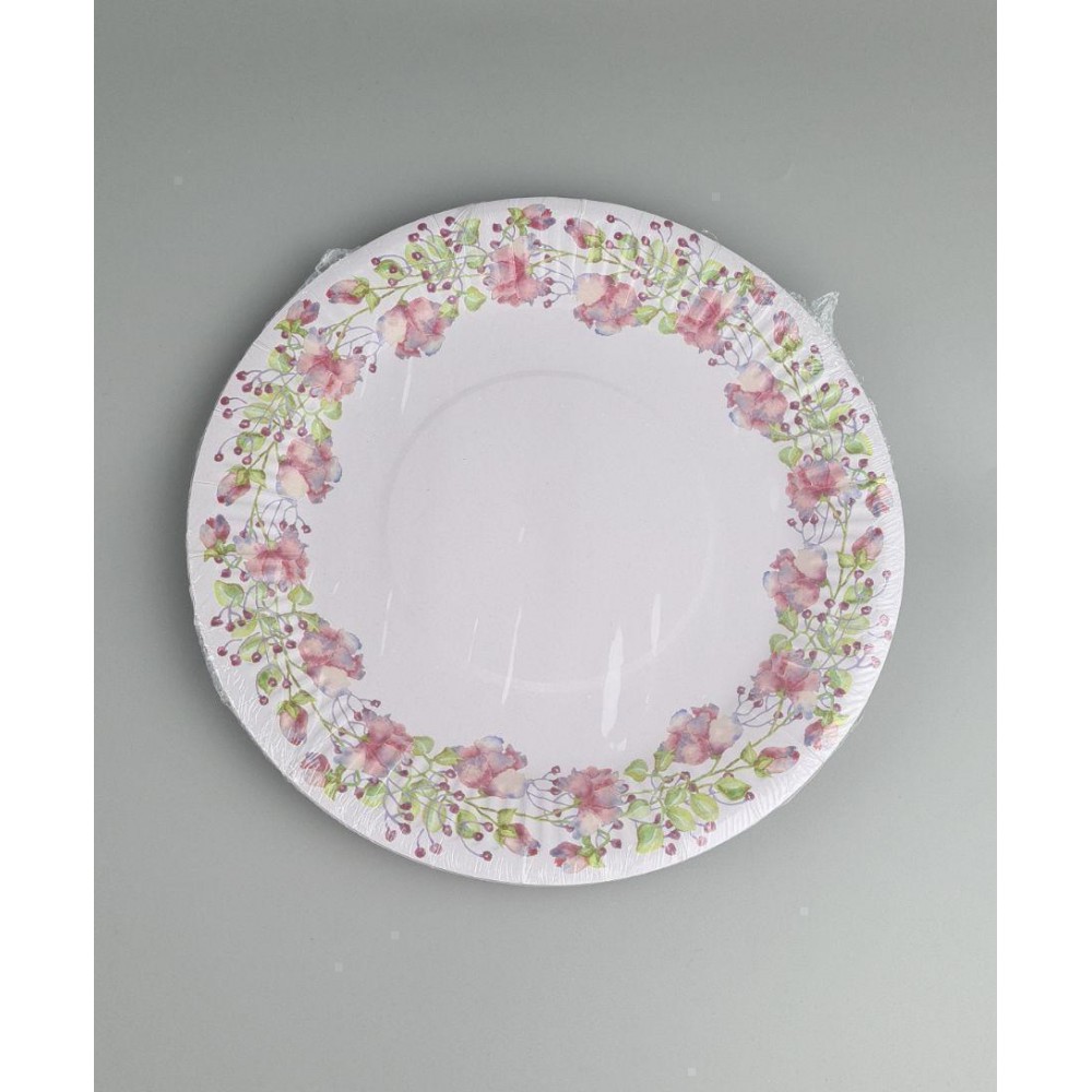 Бумажная тарелка. Используется совместно с другими элементами коллекции по дизайну (салфетки, приборы, скатерти и т.п.) как украшение стола или по своему непосредственному назначению.