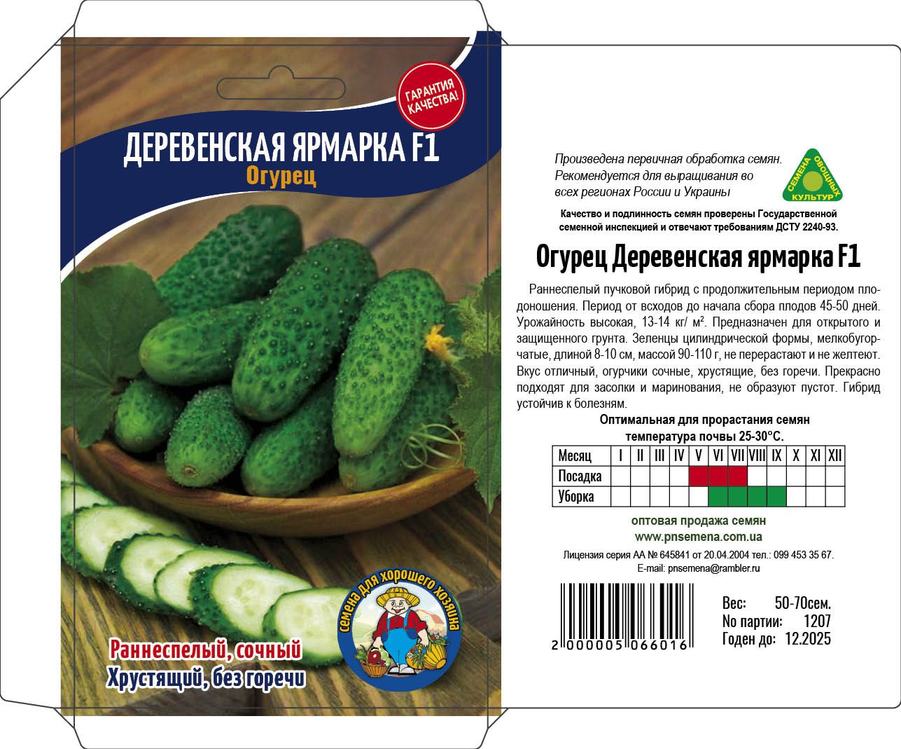 Раннеспелый пчёлоопыляймый гибрид с продолжительным периодом плодоношения. Период от всходов до начала сбора плодов 45-50 дней. Предназначен для открытого и защищенного грунта. Зеленцы цилиндрической формы, мелкобугорчатые, длиной 8-10см, массой 90-110г, не перерастают и не желтеют. Вкус отличный, огурчики сочные, хрустящие, без горечи. Прекрасно подходят для засолки и маринования, не образуют пустот