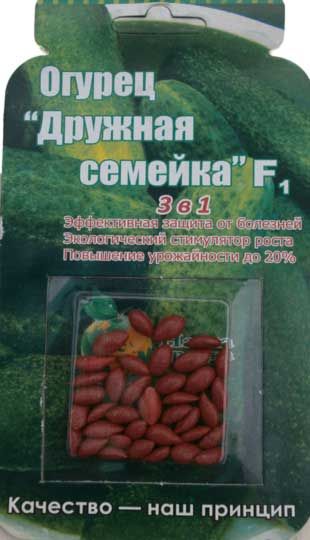 ОГУРЕЦ «ДРУЖНАЯ СЕМЕЙКА» Сорт огурца среднеранний, подходит для выращивания в теплице. Период созревания от всходов до сбора урожая от 43 до 48 дней. Растение с женским типом цветения, формирует в узле по 2-4 завязи. Плоды небольшие, вытянутые, зелёного цвета, с отличными вкусовыми качествами. Длина зеленцов от 10 до 12 см. Вкусовые качества плодов хорошие. Рекомендуется для потребления в свежем виде, засола и консервирования.Предназначен для выращивания во всех зонах Украины. ДРАЖИРОВАННЫЕ СЕМЕНА соотвествуют всем нормативным нормам Украины.