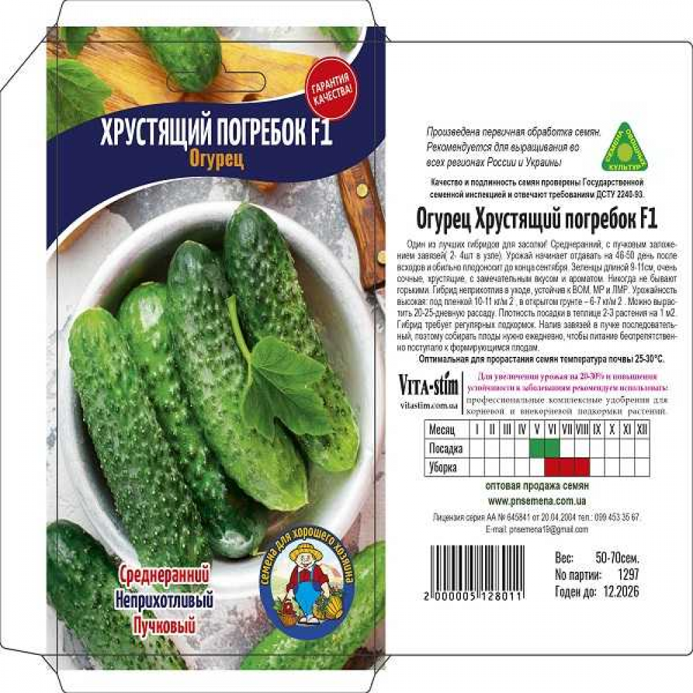 Новый скороспелый гибрид с пучковым заложением завязей. Срок созревания 45-47 дней. Растение преимущественно женского типа цветения. Корнишоны мелкобугорчатые, длиной 8-10 см, плотные, хрустящие, нежные, очень вкусные, без горечи, не образуют пустот. Рекомендуется для непосредственного потребления, засолки и маринования. Рекомендуется для выращивания в открытом грунте .