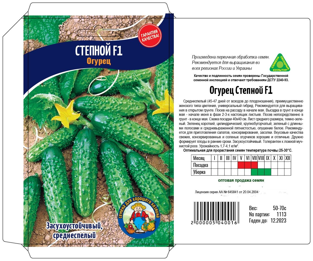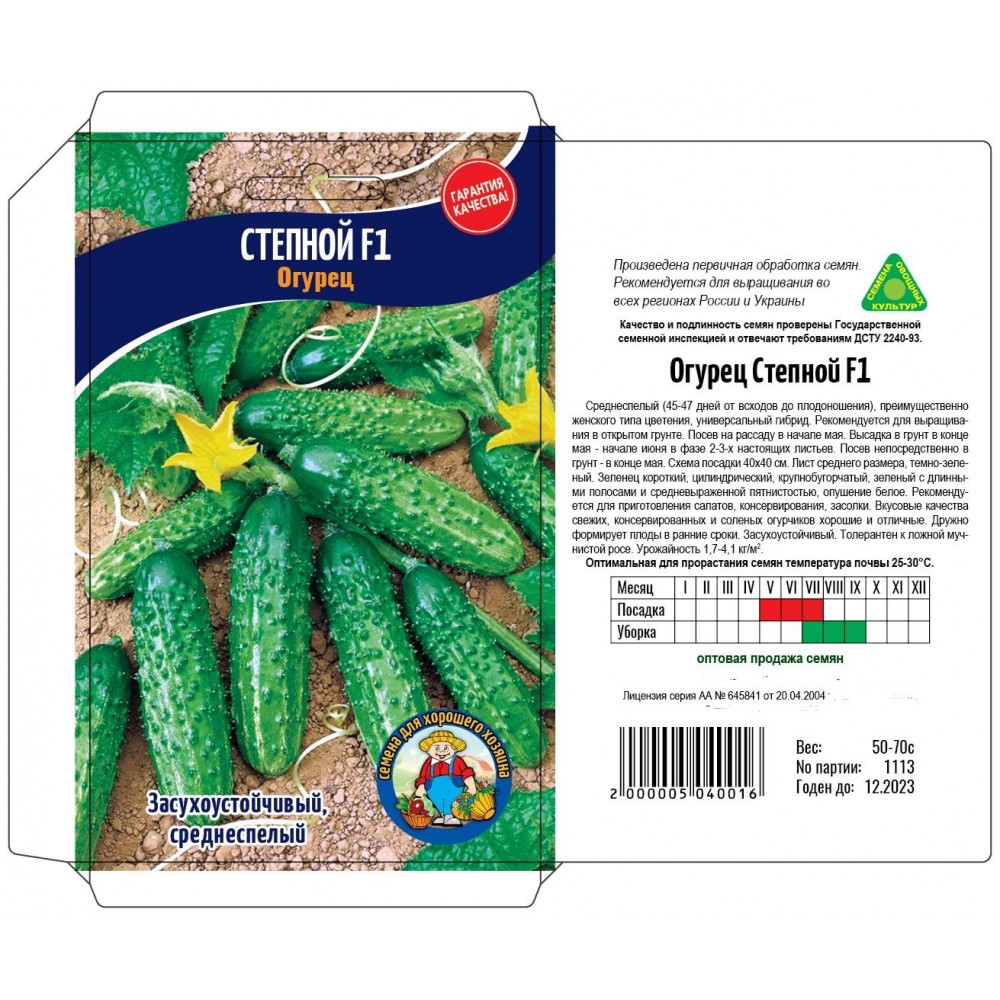 Среднеспелый (45-47 дней от всходов до плодоношения), преимущественно женского типа цветения, универсальный сорт. Рекомендуется для выращивания в открытом грунте. Посев на рассаду в начале мая. Высадка в грунт в конце мая - начале июня в фазе 2-3-х настоящих листьев. Посев непосредственно в фунт - в конце мая. Схема посадки 40x40 см. Лист среднего размера, темно-зеленый. Зеленец короткий, цилиндрический, крупнобугорчатый, зеленый с длинными полосами и средневыраженной пятнистостью, опушение белое. Рекомендуется для приготовления салатов, консервирования, засолки. Вкусовые качества свежих, консервированных и соленых огурчиков хорошие и отличные. Дружно формирует плоды в ранние сроки. Засухоустойчивый. Толерантен к ложной мучнистой росе. Урожайность 1,7-4,1 кг/м2.