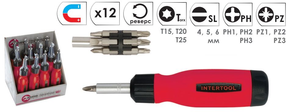 Отвертка реверсионная ТМ INTERTOOL VT-1003 позволяет закручивать или откручивать винты типа SL, PH, PZ и Torx не отрывая отвертку от винта. Трехпозиционный храповый механизм. Магнитный фиксатор позволяет быстро и надежно фиксировать биты. Есть контейнер для хранения вставок. Эргономичная прорезиненная рукоятка обеспечивает удобство захвата, а также исключает проскальзывание инструмента. В наборе 12 сменных насадок.