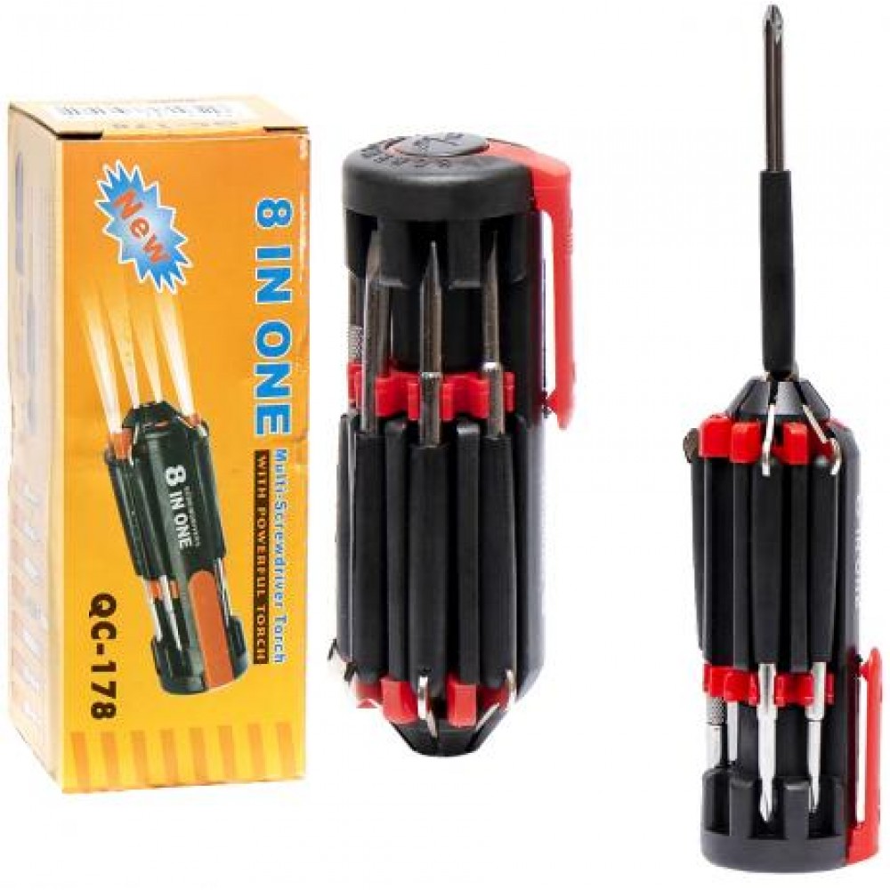 Универсальная отвертка 8в1 с фонариком. Вес 170 гр. Материал рабочей части: сталь. Материал ручки: пластик Размеры насадок отвертки – Большая крестовая/средняя/маленькая; Большая шлицевая/средняя/маленькая; Двухсторонняя разборная мини