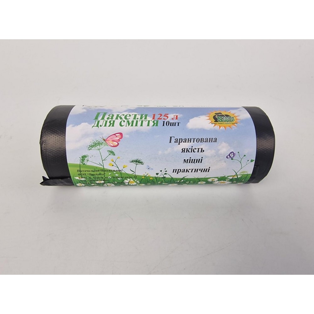 Мусорный пакет объемом 125 литров, размеры 70х105см, (10шт LD) Супер Торба черный (1 рул)