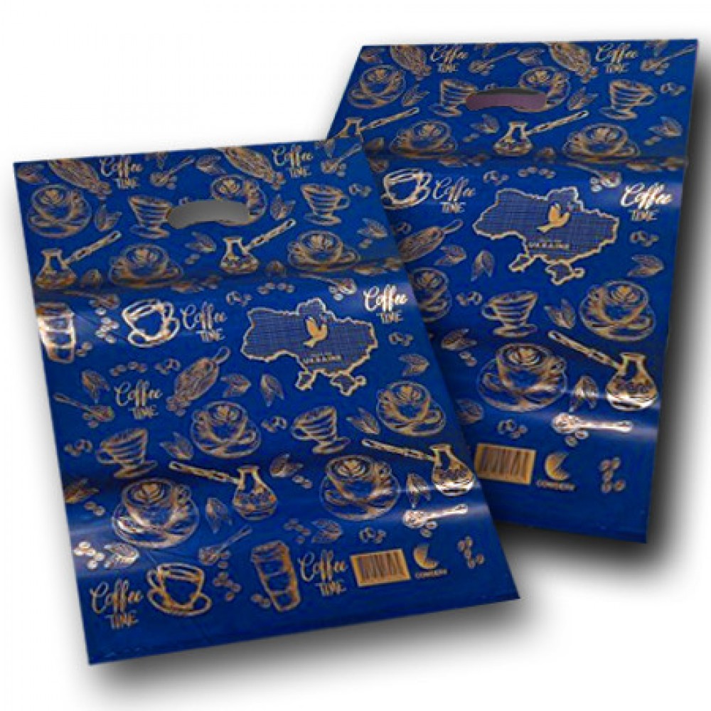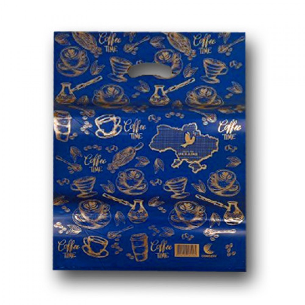 Пакет полиэтиленовый с рисунком с прорезной ручкой "Кофе" синий размер 40х50 Комсерв 25 шт/уп.