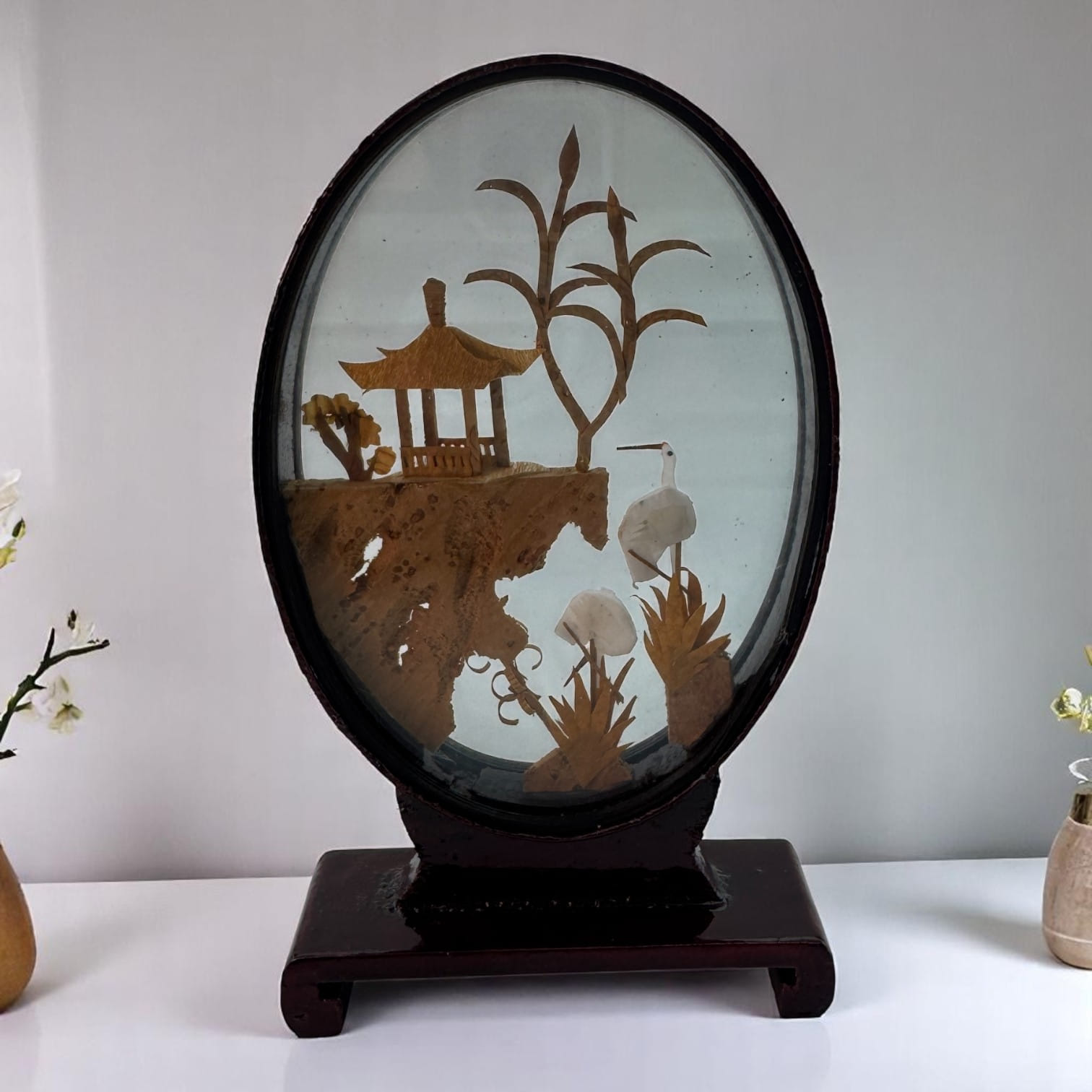 Изящная миниатюрная композиция в овальной прозрачной рамке - настоящий образец традиционного восточного искусства. Внутри изображена сцена с беседкой, бамбуком и белыми птицами, созданная из пробкового дерева - легкого природного материала, позволяющего достичь тонкой детализации и объемного эффекта.