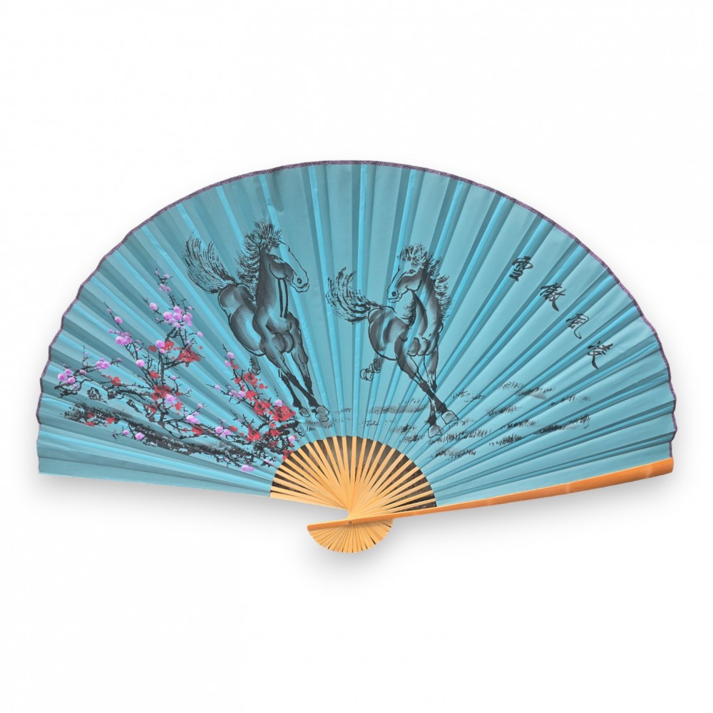 На веере изображены Лошади, символизирующие долголетие и счастье, на красивом бирюзовом фоне.. Этот мотив придаст вашему интерьеру восточный колорит и загадочность.