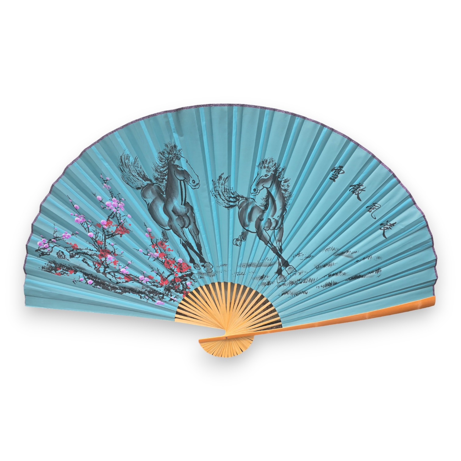 Веер настенный Лошади с сакурой на бирюзовом фоне ткань (122х6х 211 см)
