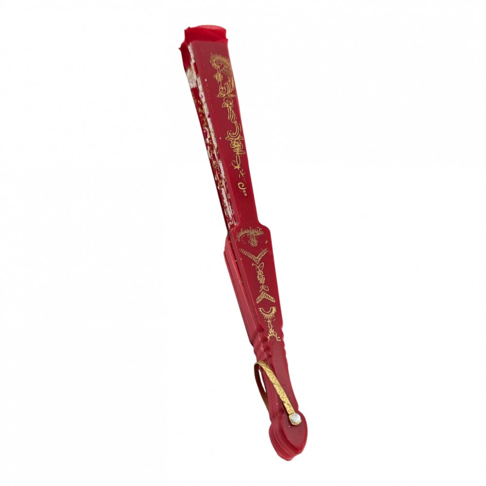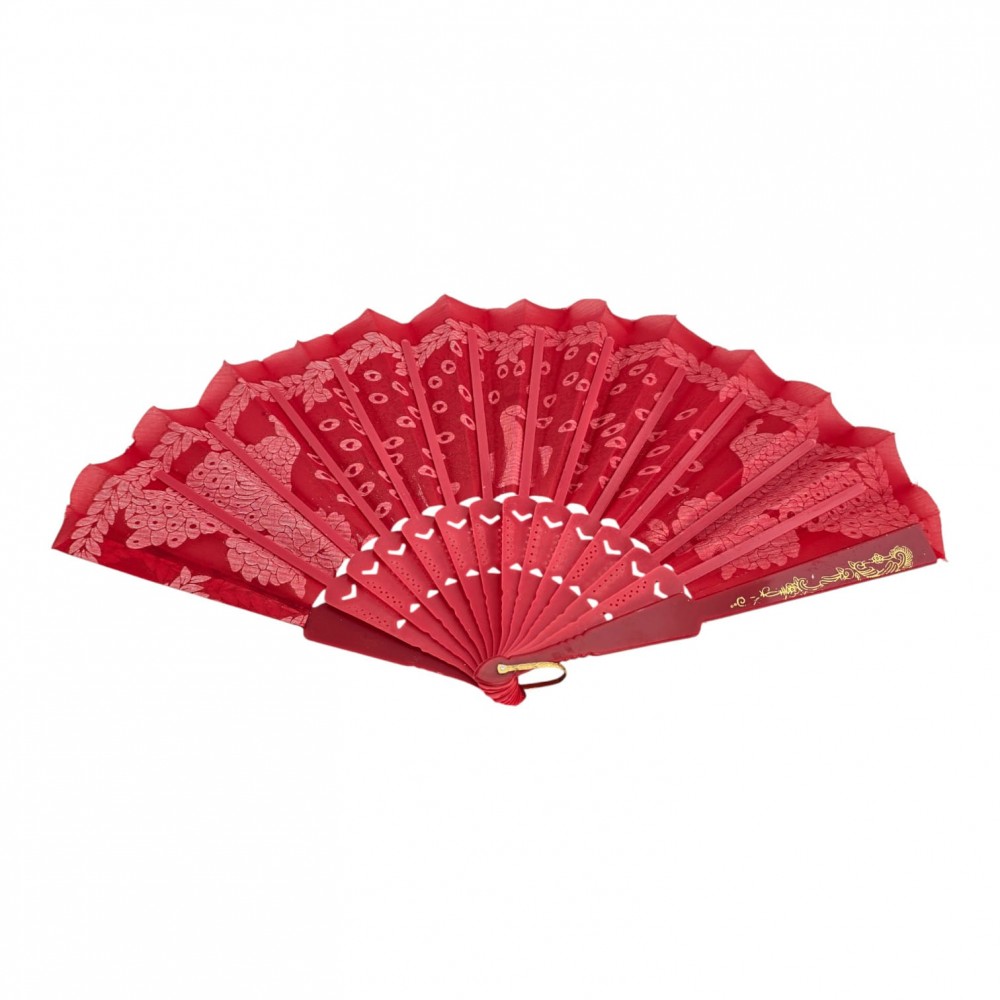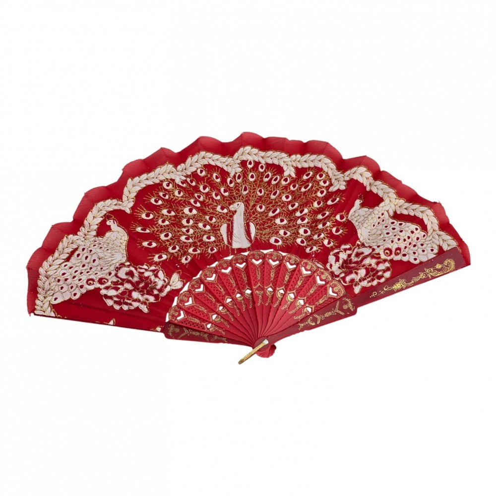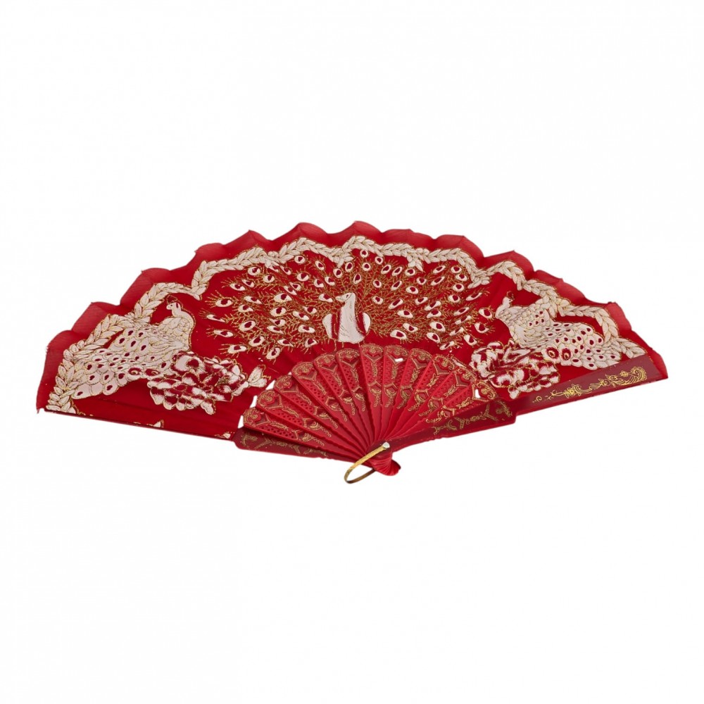 Элегантный красный веер с ярким принтом павлинов и золотистым кружевным декором. Легко раскрывается, создаёт приятный поток прохладного воздуха и эффектно дополняет летние образы, фотосъёмки, тематические мероприятия и сценические номера. Удобная петелька позволяет подвесить веер или закрепить на запястье.