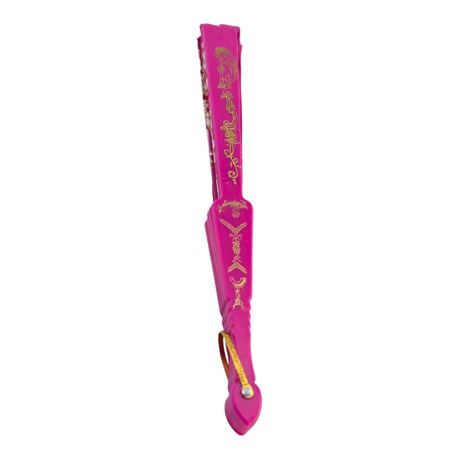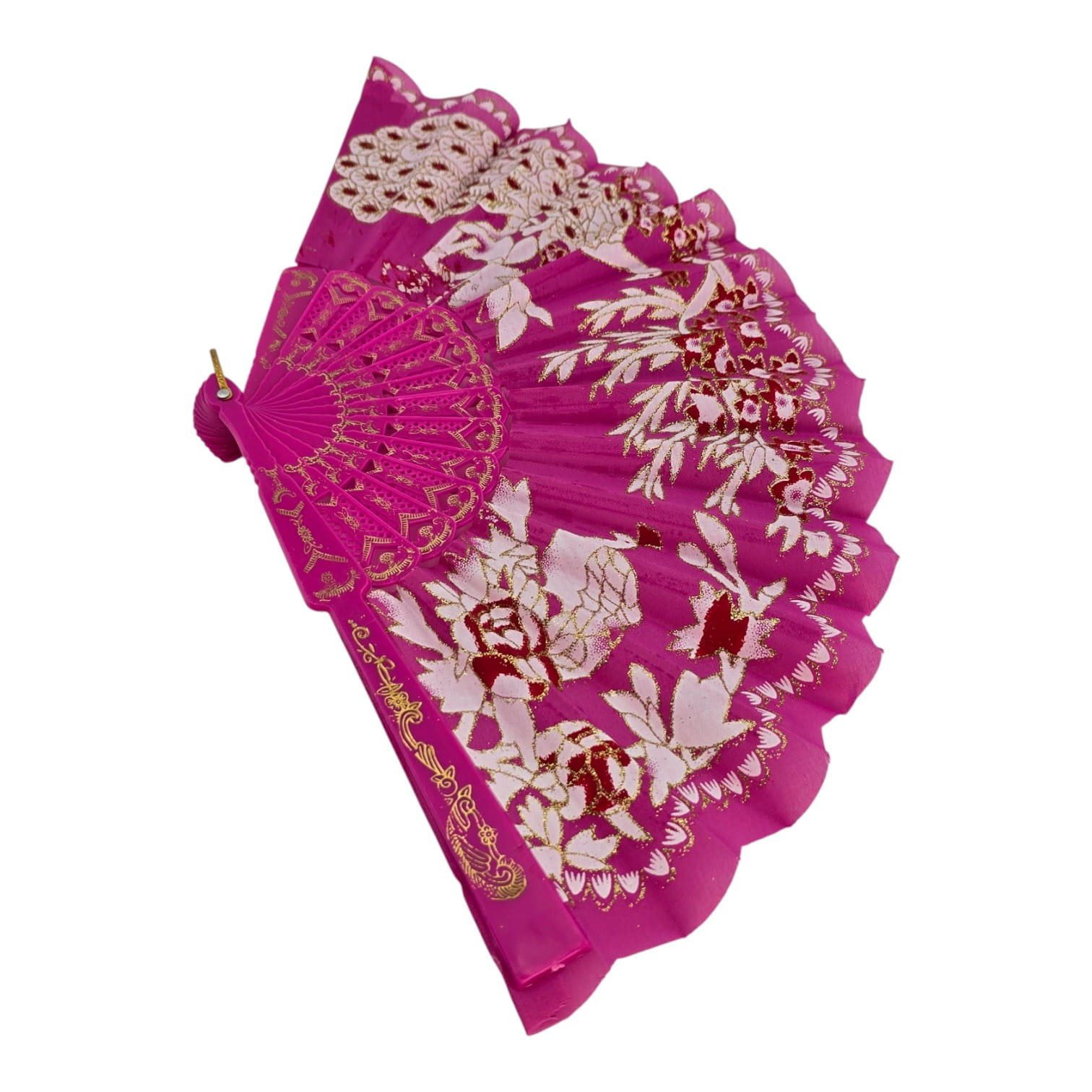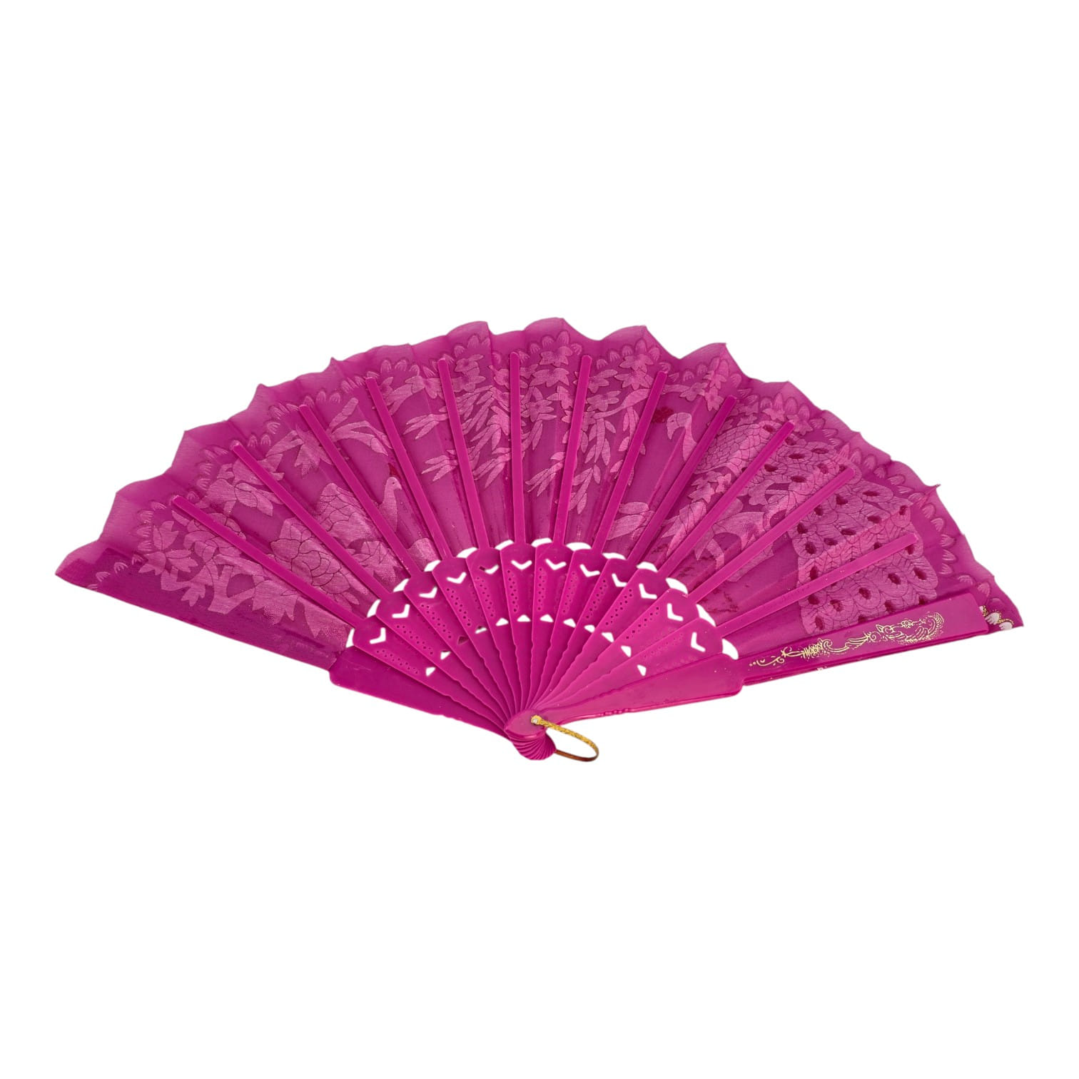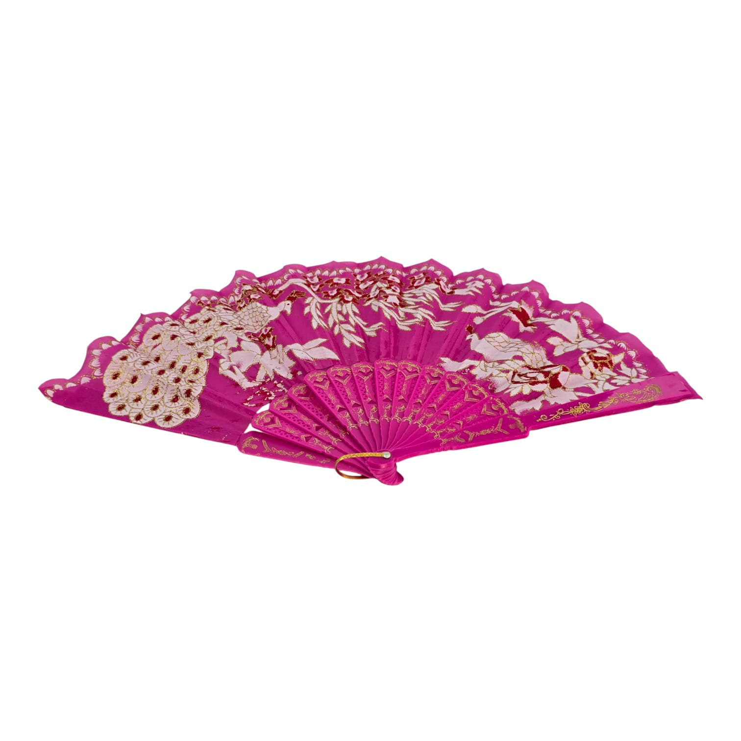 Яркий малиновый веер с рисунком павлинов и пионов и золотистым кружевным декором. Лёгкий, быстро раскрывается и дарит приятную прохладу. Подходит для повседневного использования в жару, фотосессий, праздников, тематических вечеринок и сценических выступлений. Оснащён петлёй для подвеса или ношения на запястье.