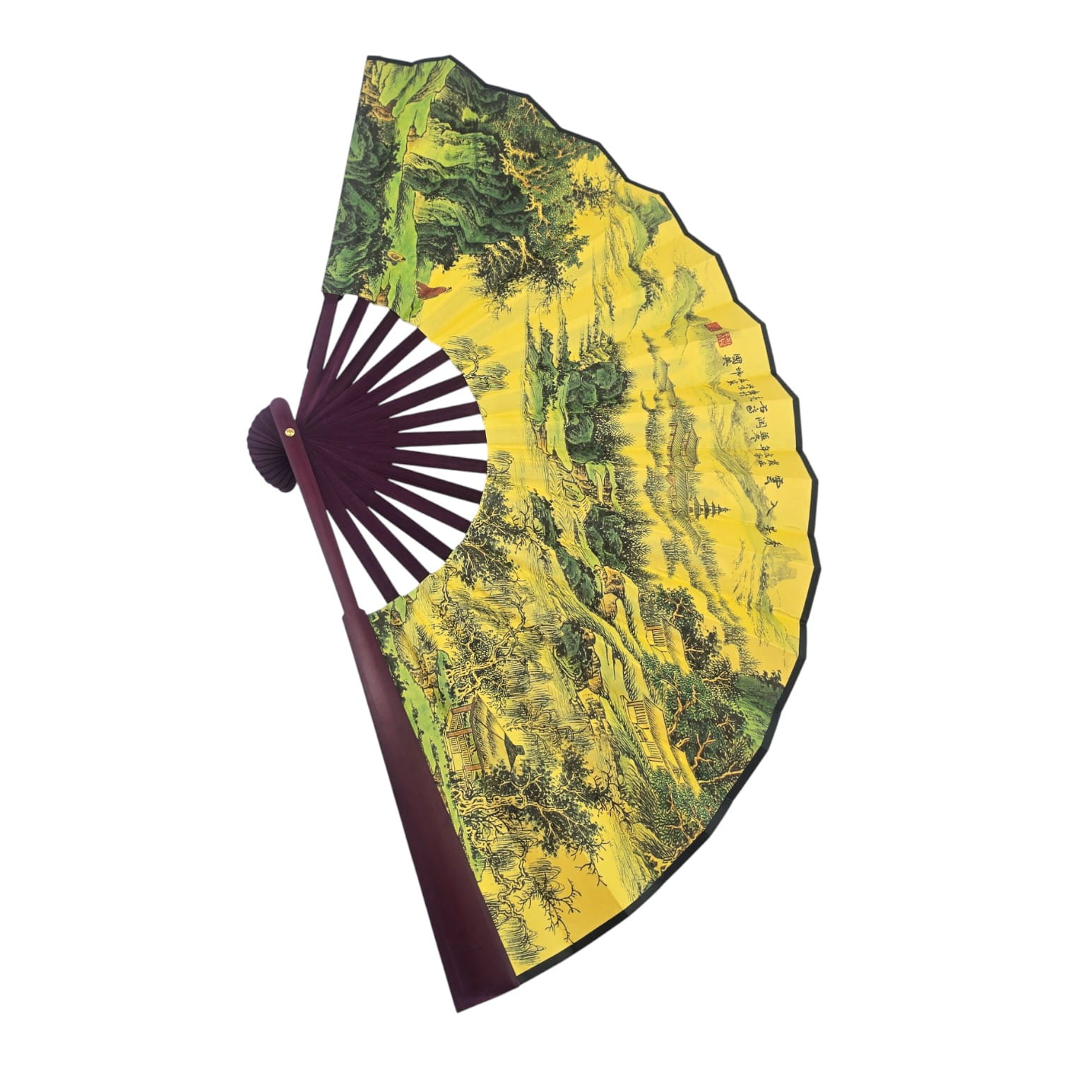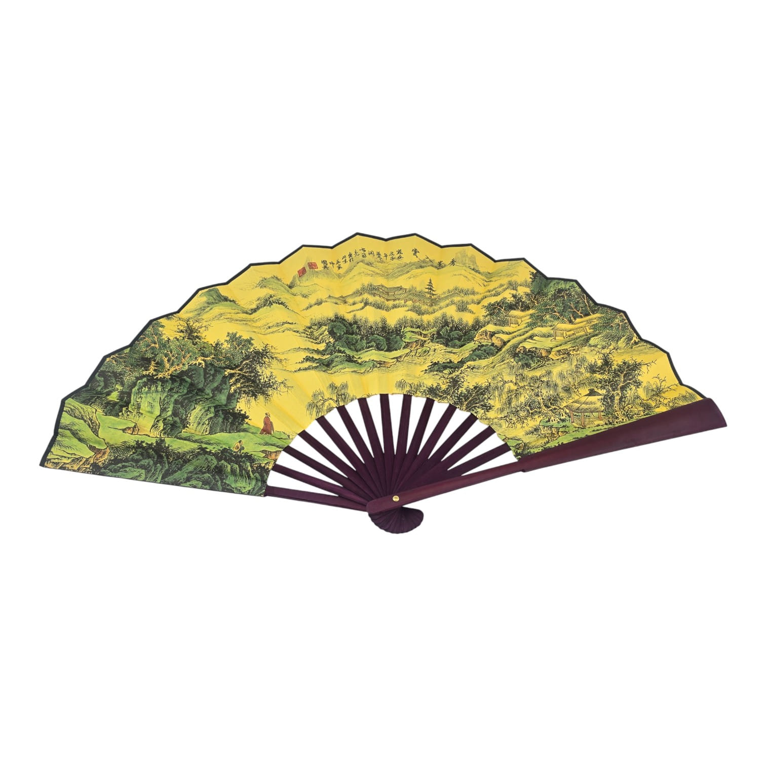 Декоративный веер с бамбуковыми спицами и шелковым полотном. На одной стороне - классический китайский пейзаж с горами и рекой, на обратной - вертикальная каллиграфия. В сложенном виде удобен для хранения и поездок, в раскрытом - служит выразительным акцентом для интерьера, фотосессий, праздников и танцевальных номеров.