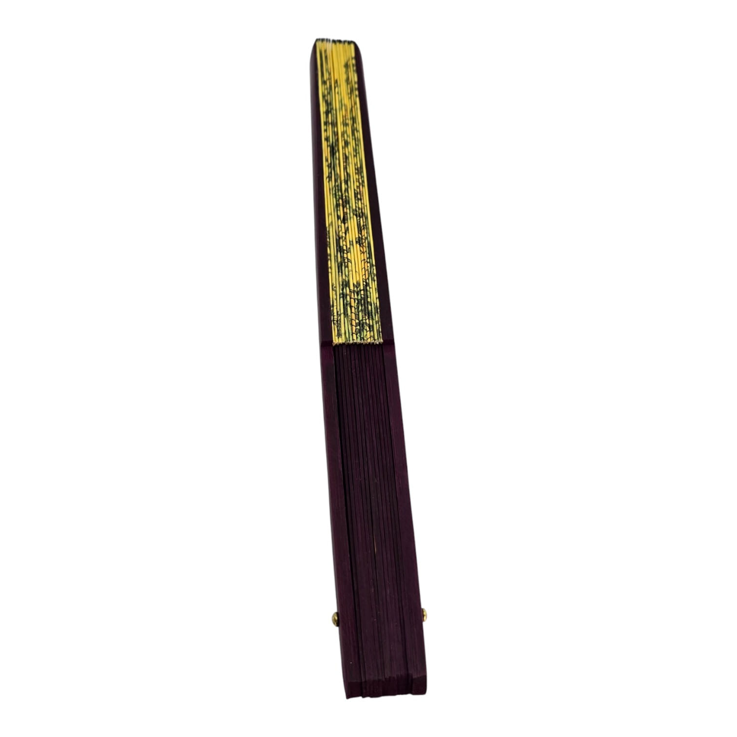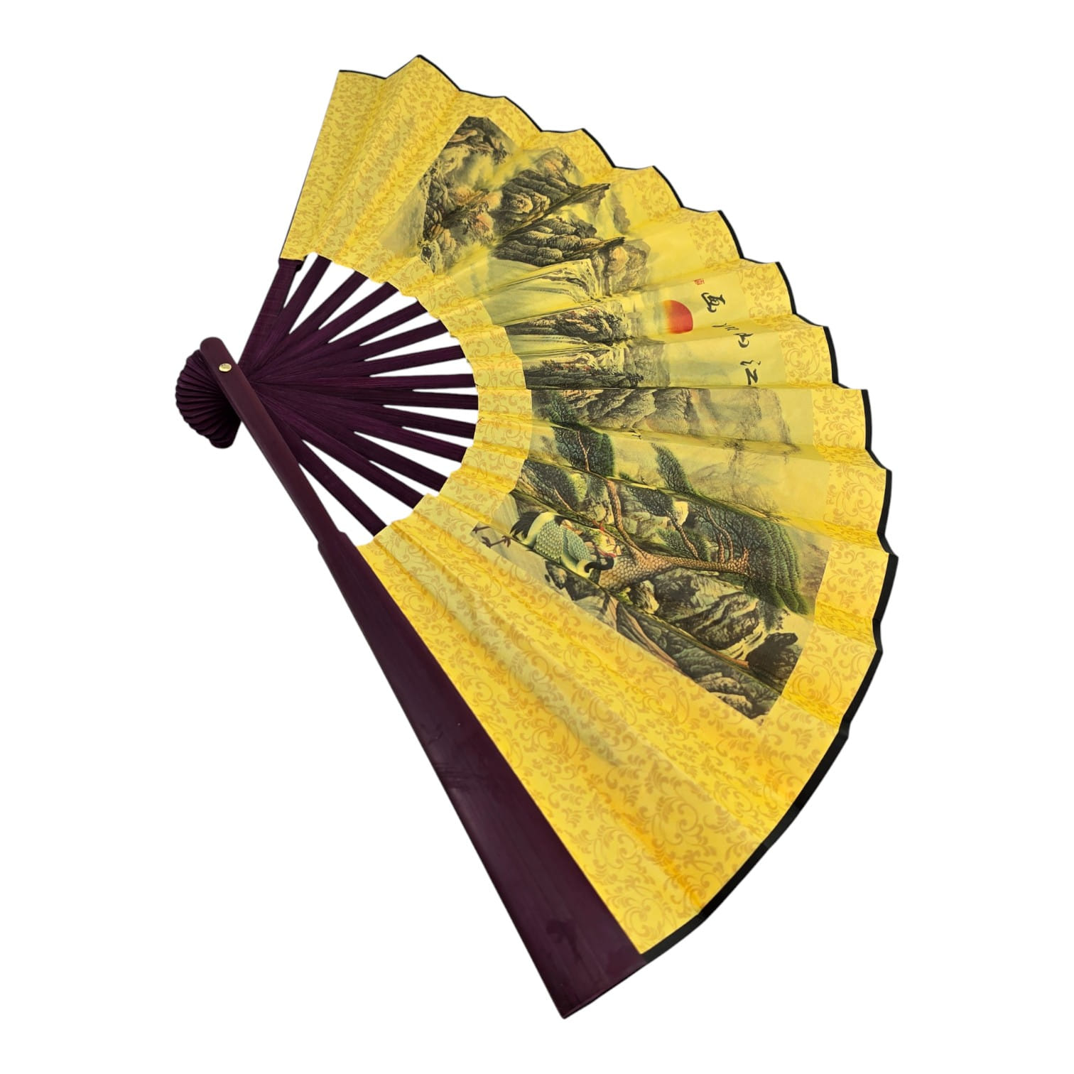 Лёгкий складной веер с бамбуковыми спицами и шёлковым полотном. На лицевой стороне - горный пейзаж с водопадом и солнцем, на обороте - каллиграфия. Подойдёт для охлаждения летом, фотосессий, танцев, декора интерьера или подарка любителям восточной эстетики. В раскрытом виде держит форму и эффектно смотрится на стене.