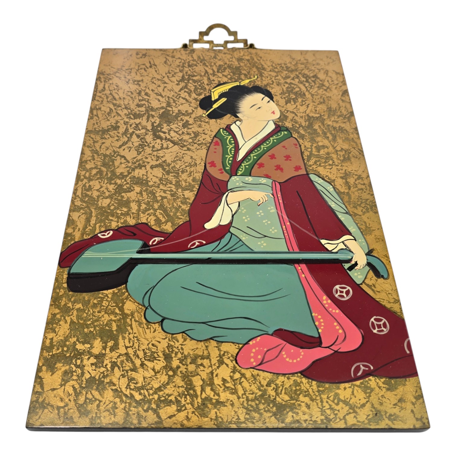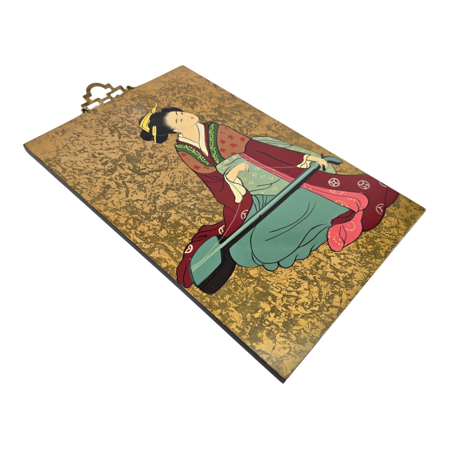 Тематика изображения: японка с музыкальным инструментом на золотистом фоне