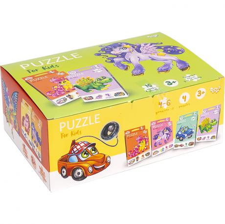 Розвиваючі пазли для малюків "Puzzle для малюків" 4-6 двосторонніх деталей, з яких можна зібрати 4 яскраві картинки. Розмір 13х9х2,5см. Вік 3+