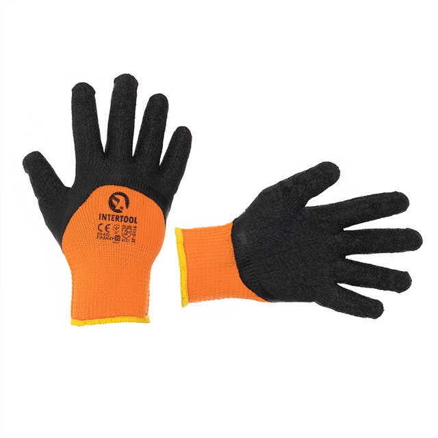 Перчатка оранжевая вязанная акриловая утепленная, покрытая черным морщинистым латексом 10" INTERTOOL SP-0116