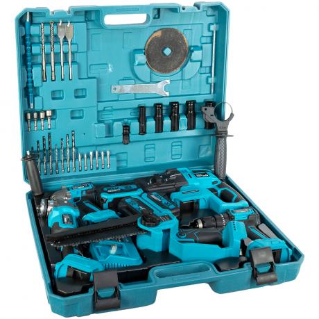 Багатофункціональний акумуляторний набір інструментів призначений для будівельних, ремонтних і садових робіт. До комплекту входить безщітковий дриль з металевим патроном 10 мм, акумуляторний гайковерт із крутним моментом до 350 Н·м, кутова шліфмашина діаметром 125 мм, а також акумуляторна ланцюгова пила з шиною 8 дюймів. Набір доповнений перфоратором з комплектом із 5 аксесуарів для свердління та ударних робіт.