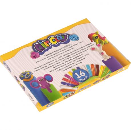 Повітряний пластилін "Air Clay" складається з 16 брикетів. Матеріал легкий, м'який і не токсичний. Не прилипає до рук, одягу та меблів. Застигає на повітрі за 3-5 годин, перетворюючись на легкий виріб. Упаковка має розміри 22х15,5х2,5 см. Рекомендовано для дітей від 3 років.