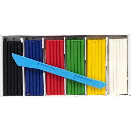 Пластилін 6 кольорів з ножиком, на восковій основі. Чи не липне до рук, не токсичний. Матеріал для ліплення. Забарвлюється в різні кольори. Служить для виконання фігур ескізів для скульптурних робіт, невеликих моделей, творів малих форм.