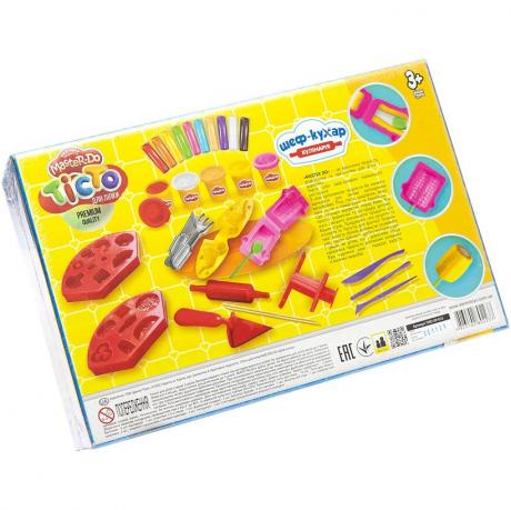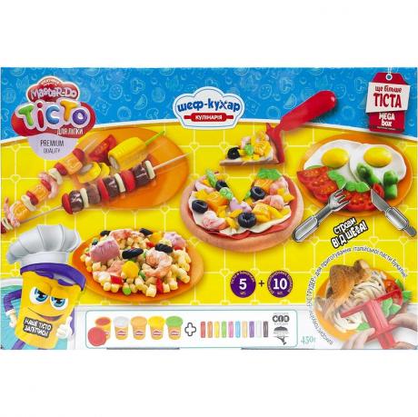 "Master Do" це набір креативного творчості для дітей та дорослих. Тісто дуже м'яке, але добре тримає форму, приємне на дотик, яскраве і безпечне. На відкритому повітрі твердне протягом 24-х годин. Для збереження еластичності зберігати в недоступному для повітря місці. Не токсичне. Комплект містить: тісто в брикетах 10шт, тісто в баночках 5шт, екструдер, комплект з трьох стеків, формочки складні 2шт, блистерні форми 2шт, скалка, лопатка для піци, паличка для шашлику, набір іграшкових столових приладів, інструкція. Вік 3+. Оформлення українською мовою. Розмір упаковки 34 * 22 * 8 см.