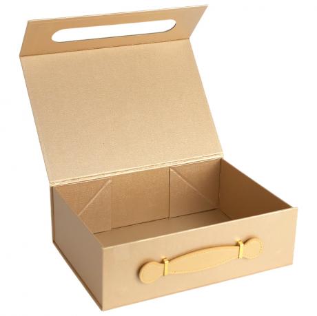 Подарункова складна коробка з ручкою призначена для оформлення подарунків та презентаційної упаковки. Розмір — 33×25×12 см. Розмір в упаковочному пакеті — 48,4×33 см. Колір — золотий. Поверхня коробки має рельєфну текстуру під шкіру, що надає виробу акуратного та презентабельного вигляду. Кришка оснащена магнітною фіксацією для надійного закриття. Конструкція складна, кути фіксуються за допомогою вже нанесеної двосторонньої клейкої стрічки, що забезпечує міцність форми та зручність складання. Ручка робить перенесення зручним. Товар вигідний для оптових магазинів і підходить для роздрібного продажу.