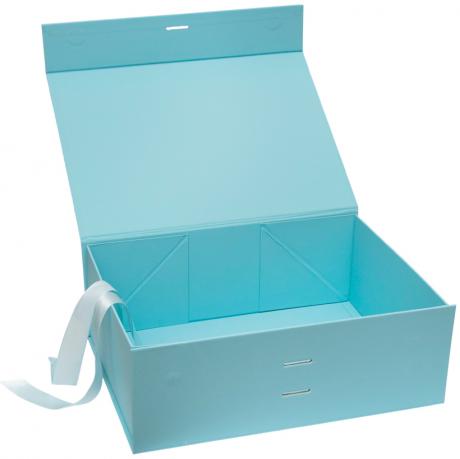 Подарункова складна коробка зі стрічкою призначена для оформлення подарунків та презентаційної упаковки. Розмір у зібраному вигляді — 33×25×12 см. Розмір в упаковочному пакеті — 48,8×33 см. Колір — блакитний. Кришка фіксується магнітами і декоративною стрічкою, яка акуратно протягується через спеціальні отвори та з’єднує її з коробкою. Конструкція складна, кути фіксуються за допомогою вже нанесеної двосторонньої клейкої стрічки, що гарантує міцність форми та зручність складання. Товар вигідний для оптових магазинів і підходить для роздрібного продажу.