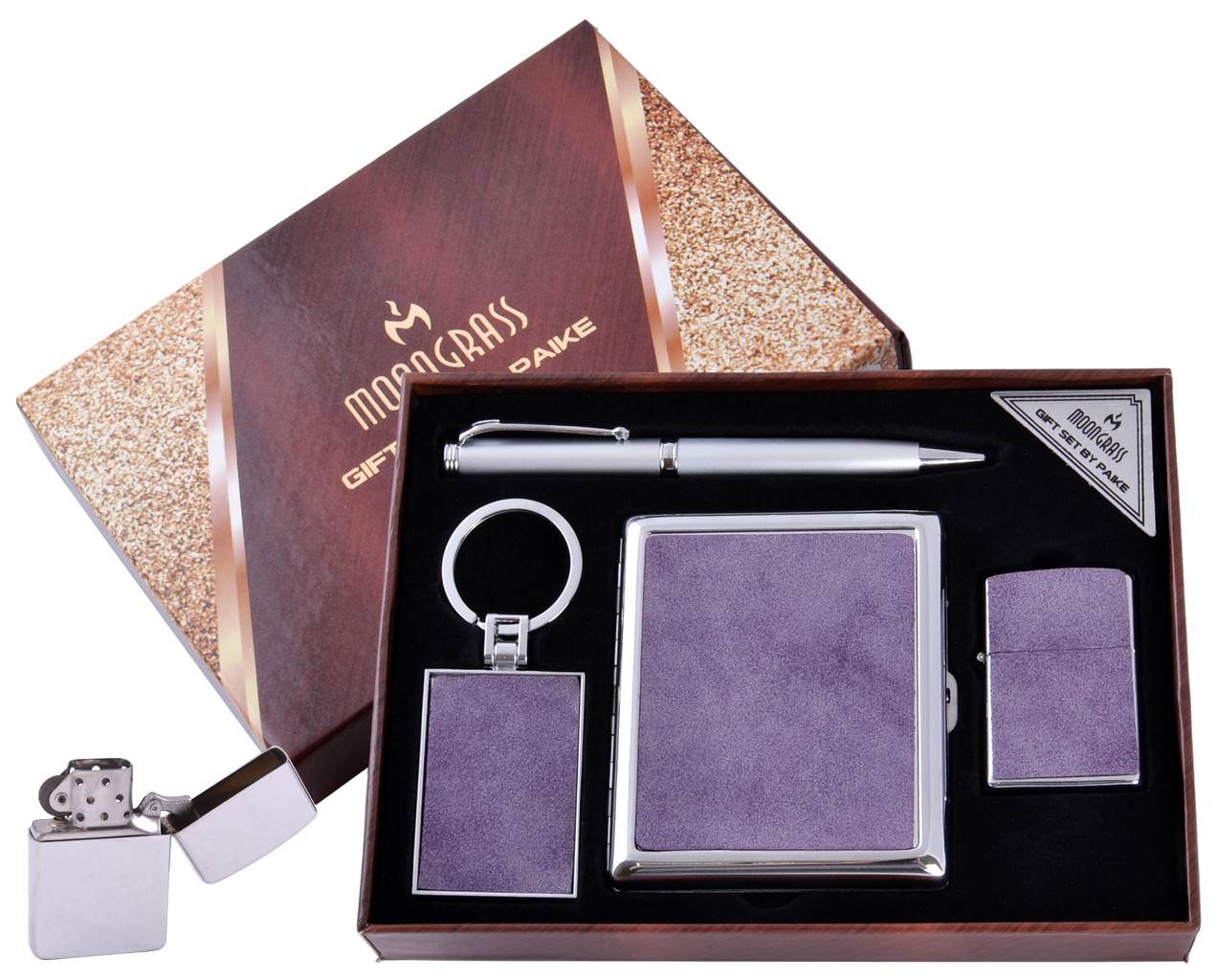 Подарочный набор 4в1 Moongrass Портсигар/Зажигалка/Ручка/Брелок (Кожа) №AL-204F