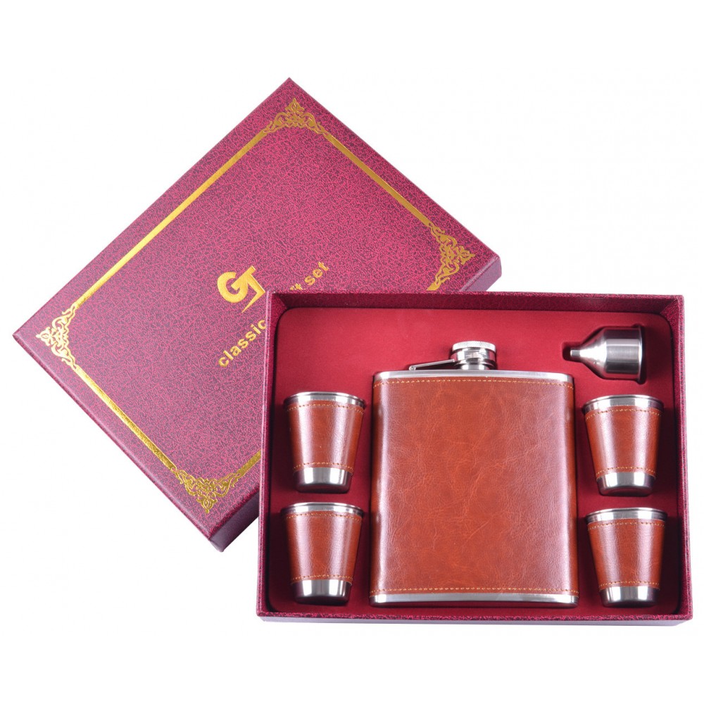 Подарочный набор фляга, 4 стопки, лейка (кожа)