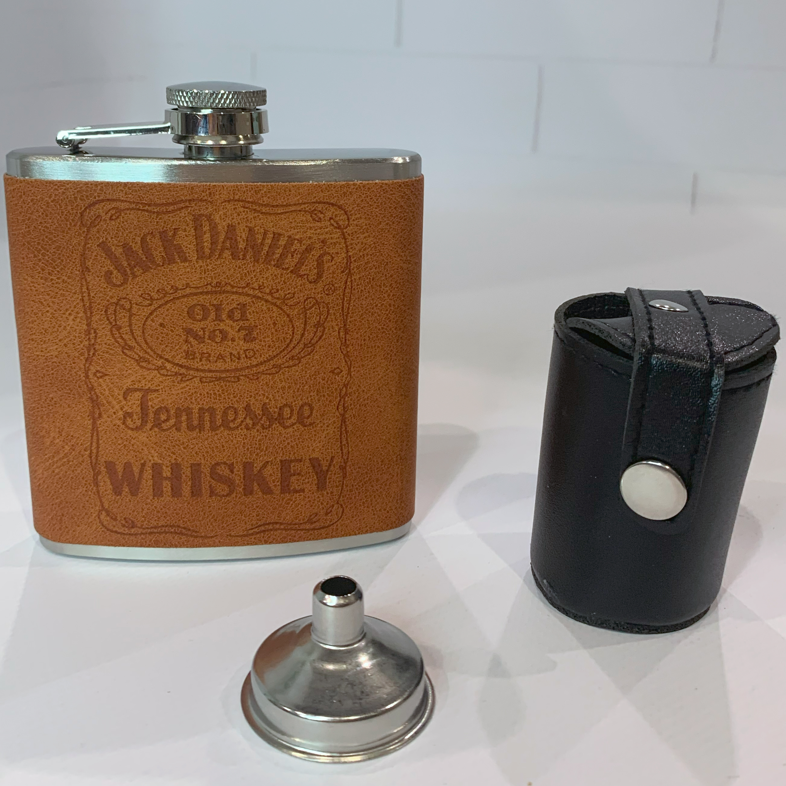 Стильный и практичный набор для настоящих ценителей отдыха на природе. В комплект входит металлическая фляга объёмом 210 мл с обложкой из эко-кожи с легендарным тиснением Jack Daniel’s Tennessee Whiskey, а также 4 рюмки, лейка для удобного наполнения и компактный футляр для хранения рюмок. Упаковано в красочную подарочную коробку.