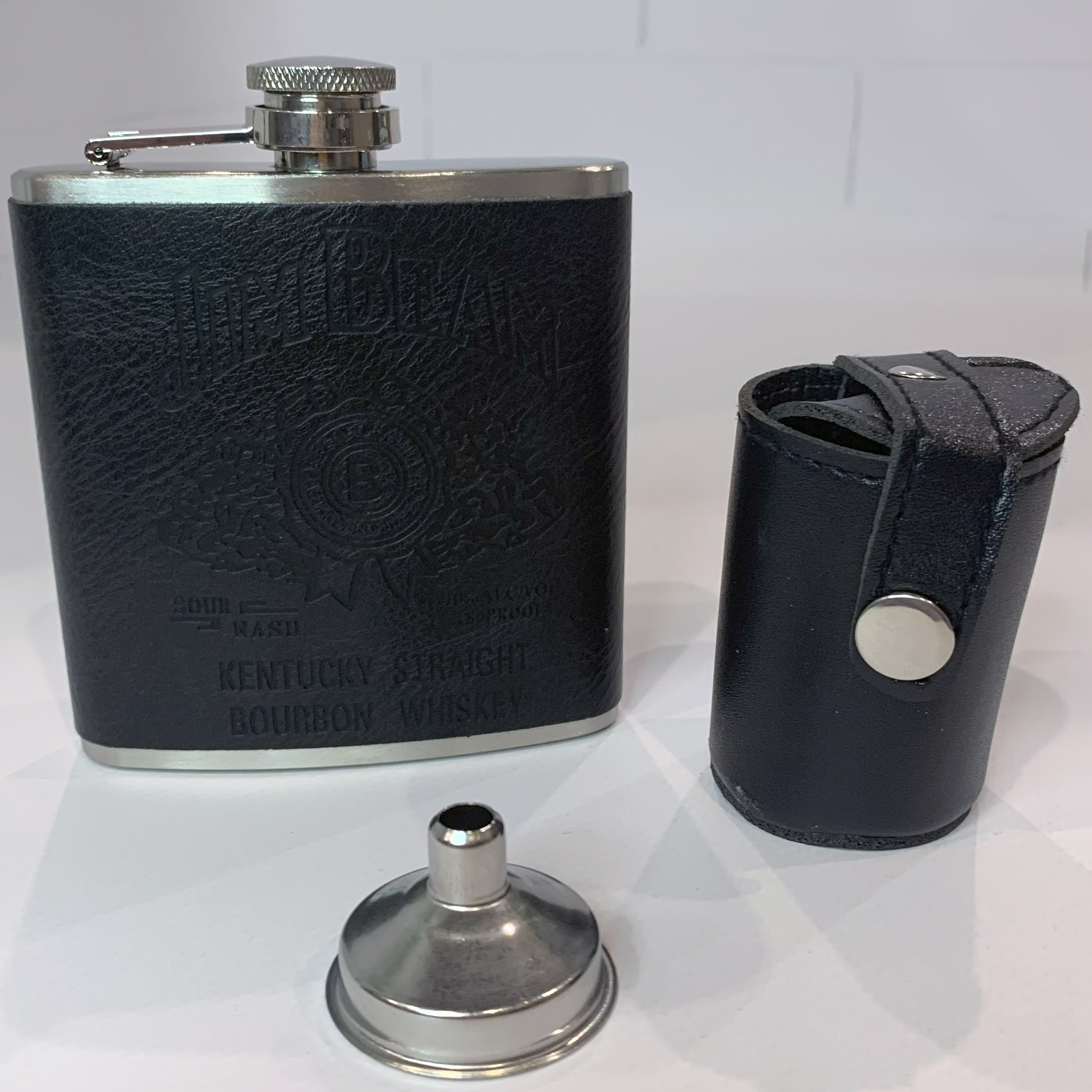 Универсальный и стильный набор для тех, кто ценит практичность и атмосферу отдыха на природе или в дороге. В комплект входит металлическая фляга объёмом 210 мл с обложкой из экокожи с тиснением Jim Beam Kentucky Straight Bourbon Whiskey, 4 рюмки из нержавеющей стали, удобная воронка для наливания и футляр для хранения рюмок. Всё упаковано в подарочную коробку.