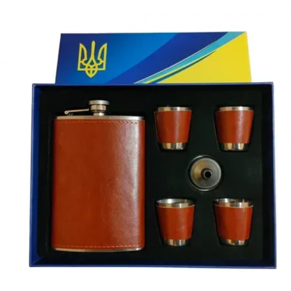 - Материал фляги и стопок: нержавеющая сталь + эко-кожа