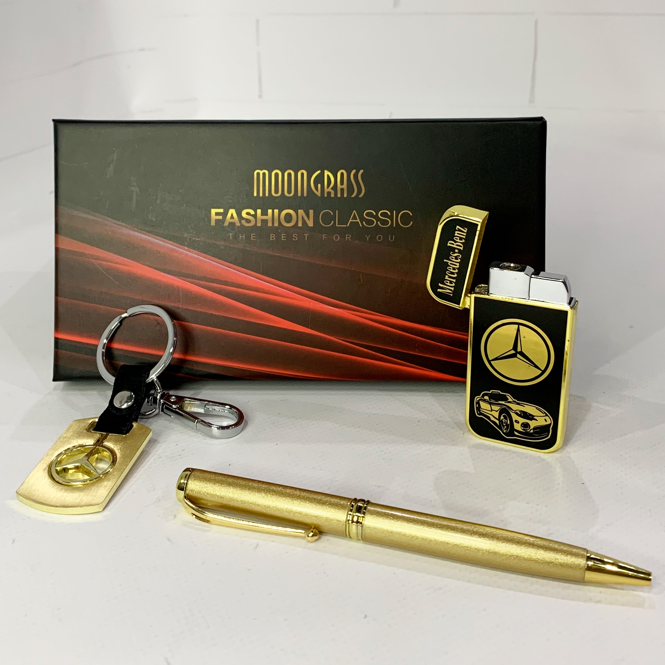Стильный мужской аксессуарный комплект, созданный для поклонников легендарного бренда Mercedes-Benz. Все элементы выполнены в едином дизайне и упакованы в элегантную подарочную коробку, что делает набор отличным выбором для подарка.