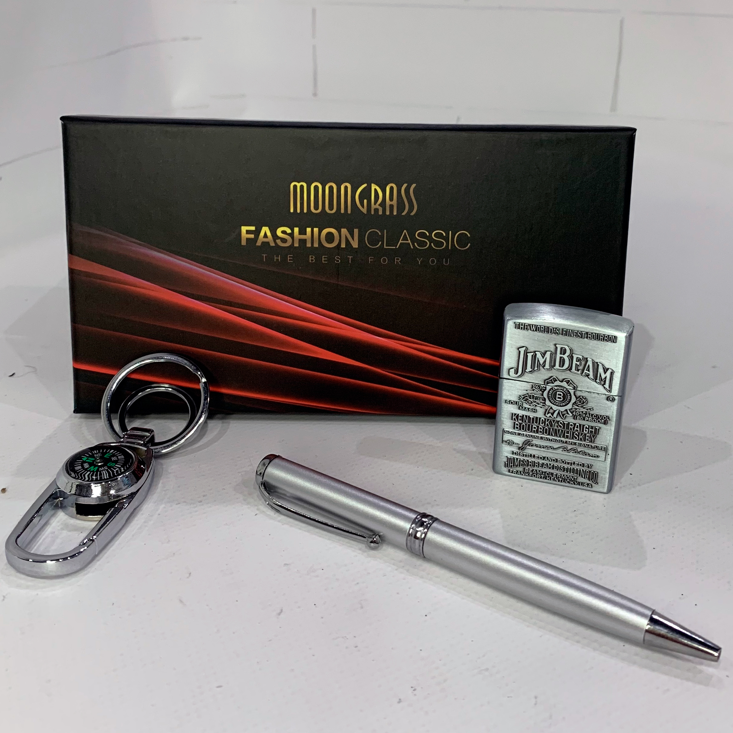 - Комплектация: брелок-карабин с компасом, металлическая ручка, газовая кремниевая зажигалка Jim Beam