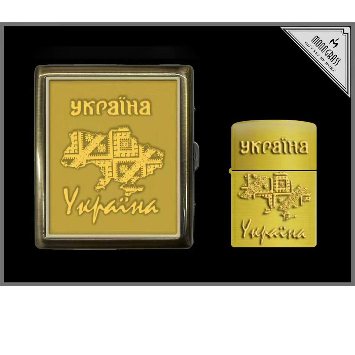 Оригинальный подарочный набор, включающий металлический портсигар и газовую зажигалку. Декорирован рельефным изображением карты Украины с традиционным украинским орнаментом и надписью «Україна». Такой набор станет отличным выбором для патриотов, коллекционеров или в качестве памятного подарка.