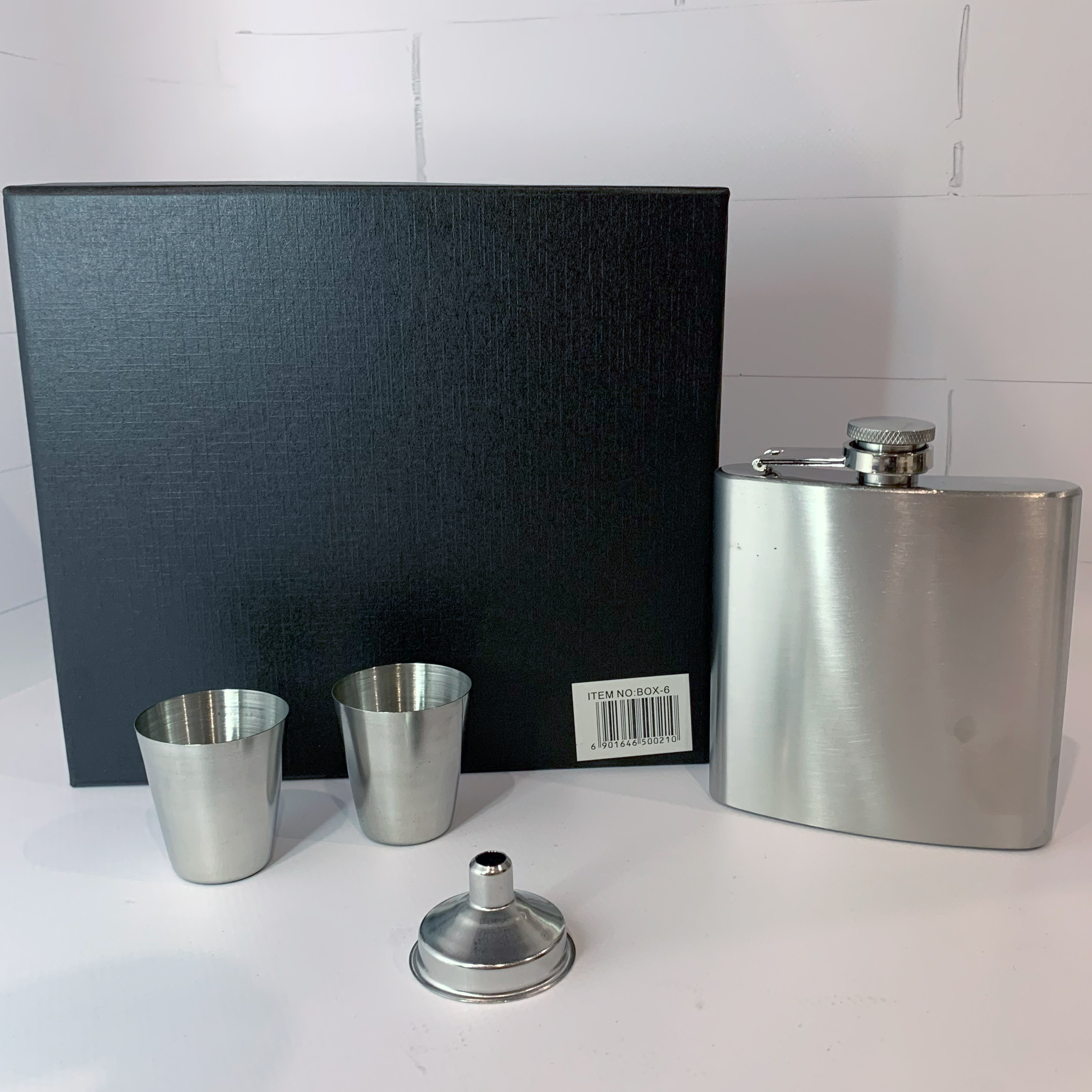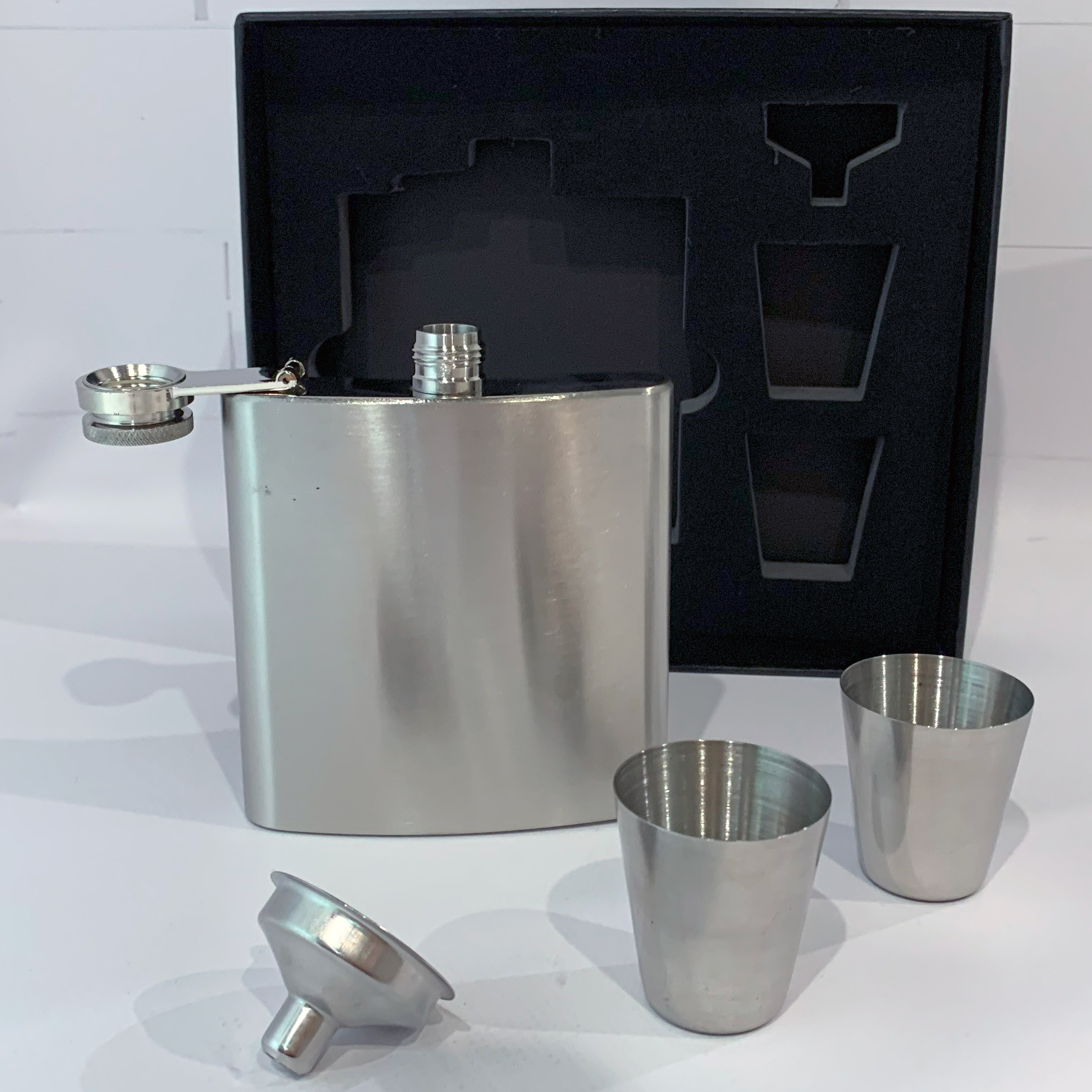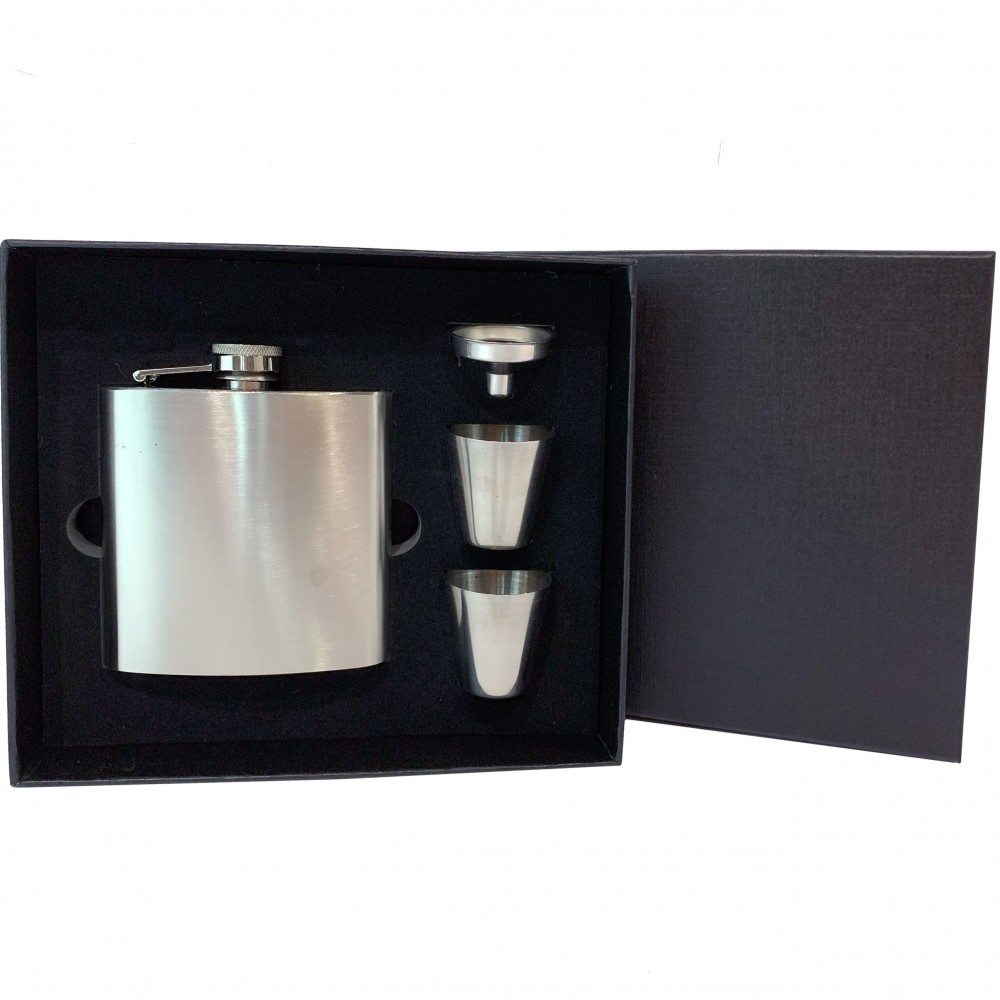 В набор входит фляга объёмом 6oz (177 мл), две рюмки по 30 мл и удобная воронка для переливания. Все элементы выполнены из высококачественной нержавеющей стали и надёжно упакованы в элегантную подарочную коробку.