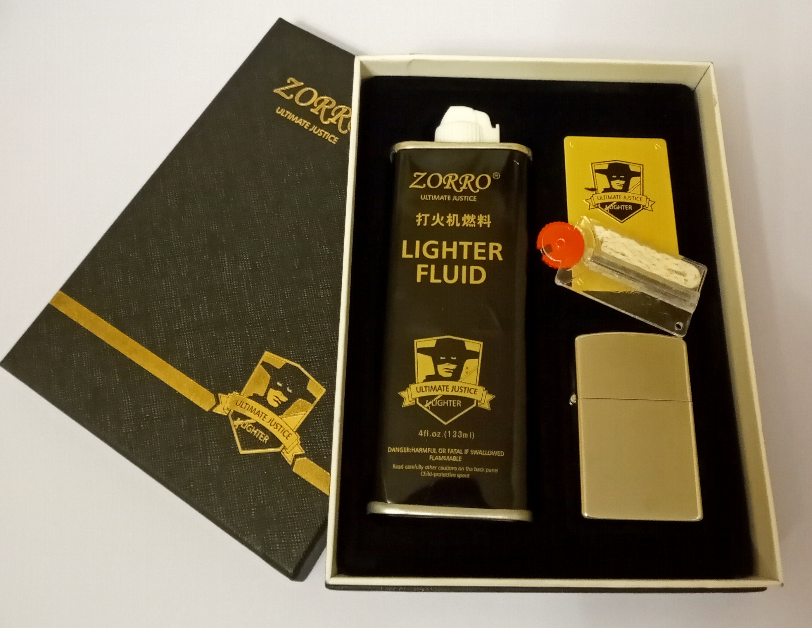 Подарунковий набір з бензиновою запальничкою (бензин/запальничка/кремінь/фітіль) Zorro HL-185Подарунковий набірЗапальничка бензиноваКремінь для запальничкиШнур для запальничкиБензин для запальнички (Об'єм: 133 мл)