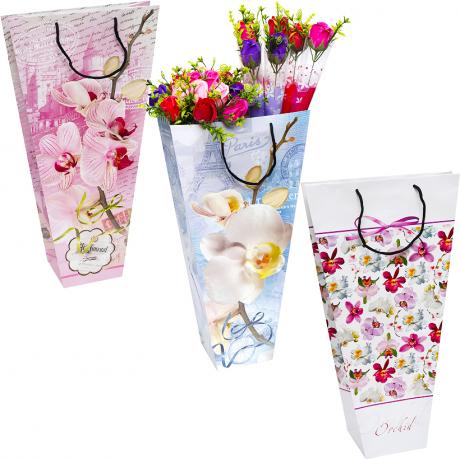 Пакет кольоровий для букетів "Орхідея". Глянцевий. Ручки шнурок. Розмір 53х27х12 см. Мікс 12 шт. Кольори в асортименті.